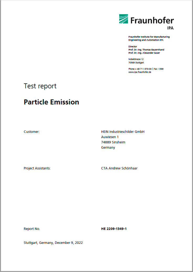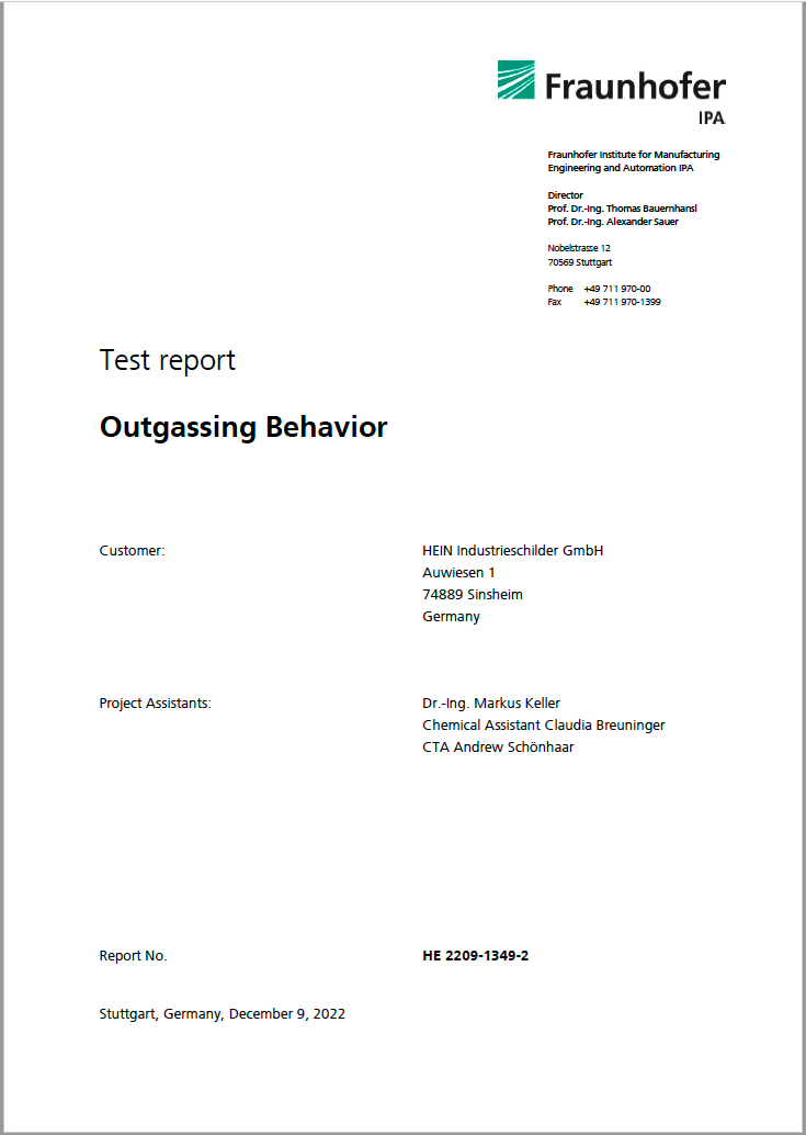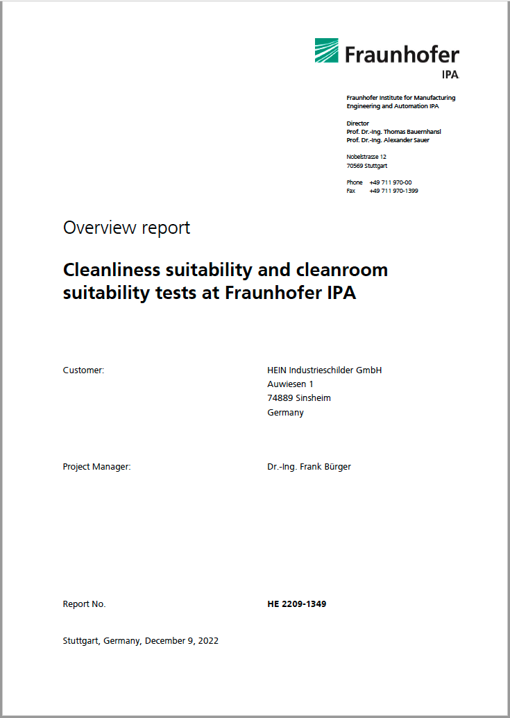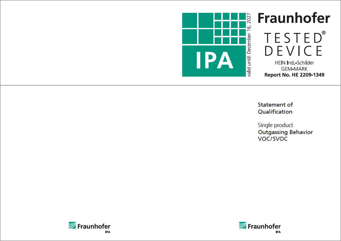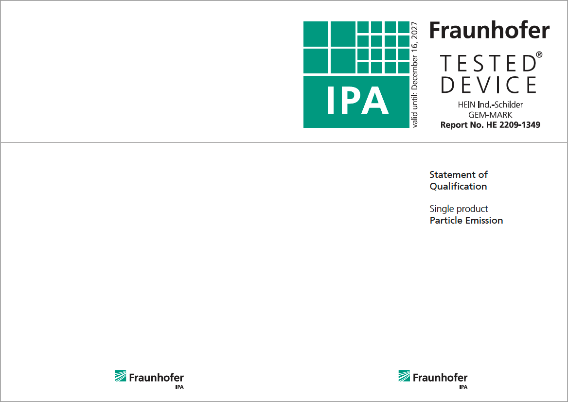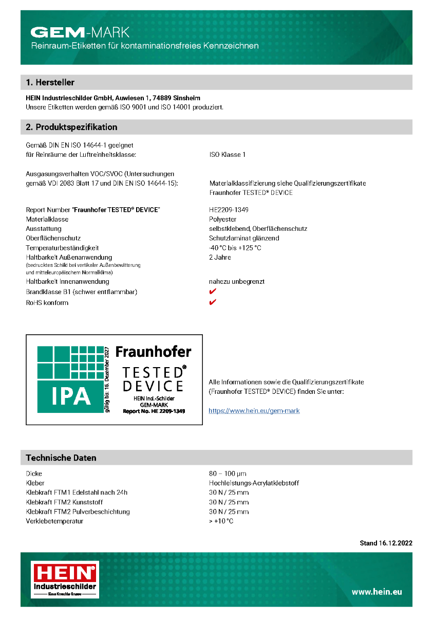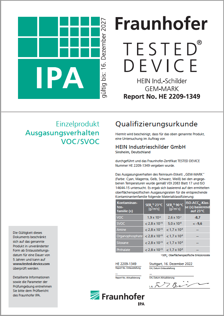 ✓GEM-MARK-Etiketten sind qualifiziert für die Reinraumtauglichkeit (Fraunhofer TESTED® DEVICE). Das betrifft das partikuläre Emissionsverhalten sowie das Ausgasungsverhalten