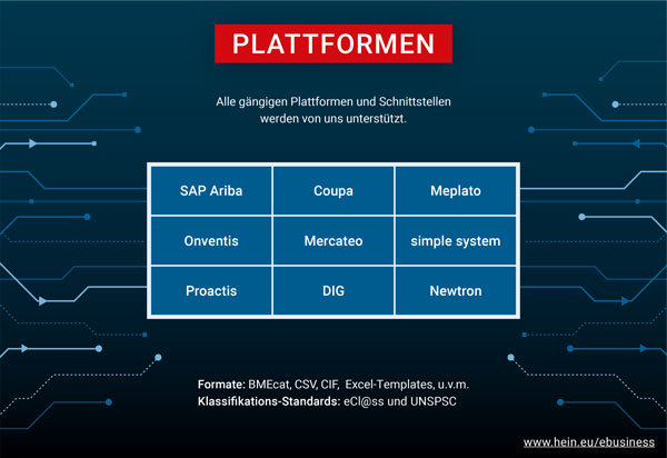 Wir bei HEIN Industrieschilder bieten alle relevanten Plattformen und Schnittstellen an. Weitere Infos sind unter www.hein.eu/ebusiness zu finden.