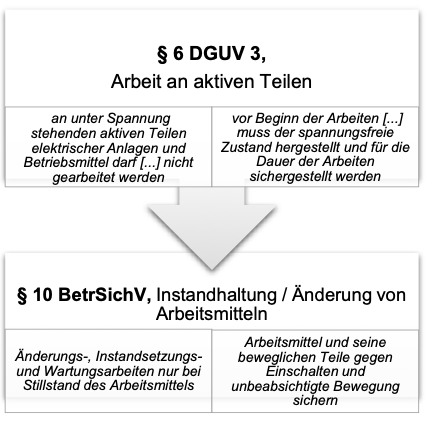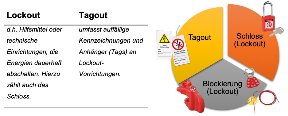 In der deutschen Gesetzgebung gibt es zudem spezielle gesetzliche Anforderungen, die das Ausschalten und „Absperren“ fordern. Diese können mit Lockout-Tagout Produkten am ehesten erfüllt werden. Zu nennen sind die DGUV Vorschrift 3 und die Betriebssicherheitsverordnung.