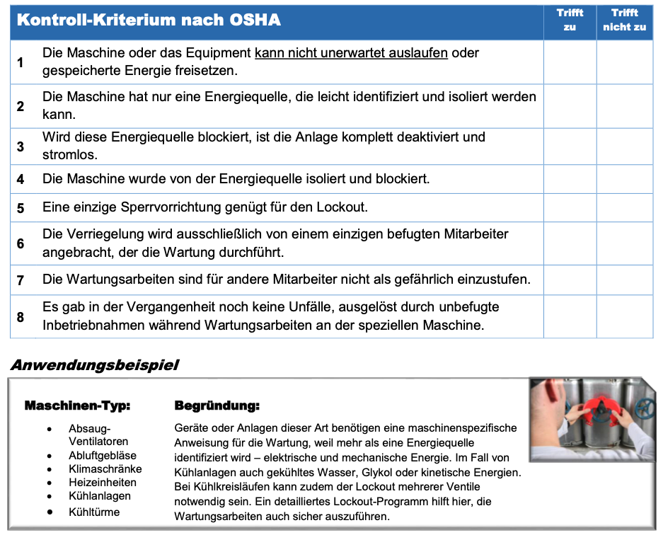 Welche Maschinen eine Lockout-Tagout Anleitung benötigen, können Sie einfach überprüfen.2 Nutzen Sie folgende Übersicht zur Orientierung.