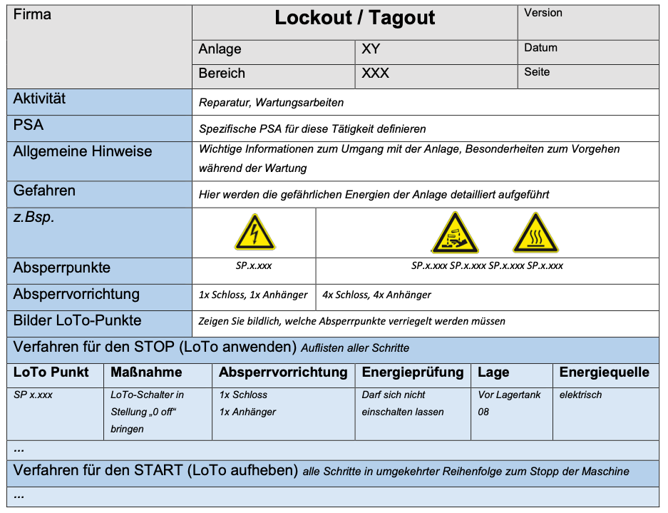 Verständliche und vollständige LoTo-Anweisungen sind Grundlage für sichere Wartungsarbeiten. Das Blockieren einer Maschine oder Anlage erfolgt bestenfalls in Übereinstimmung mit diesen festgeschriebenen Verfahren. Die wichtigsten inhaltlichen Elemente sind unter anderem:
