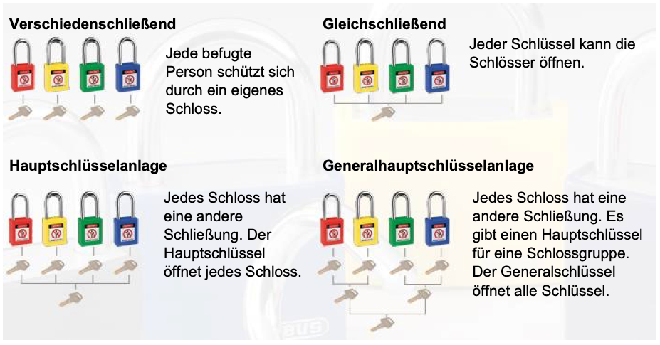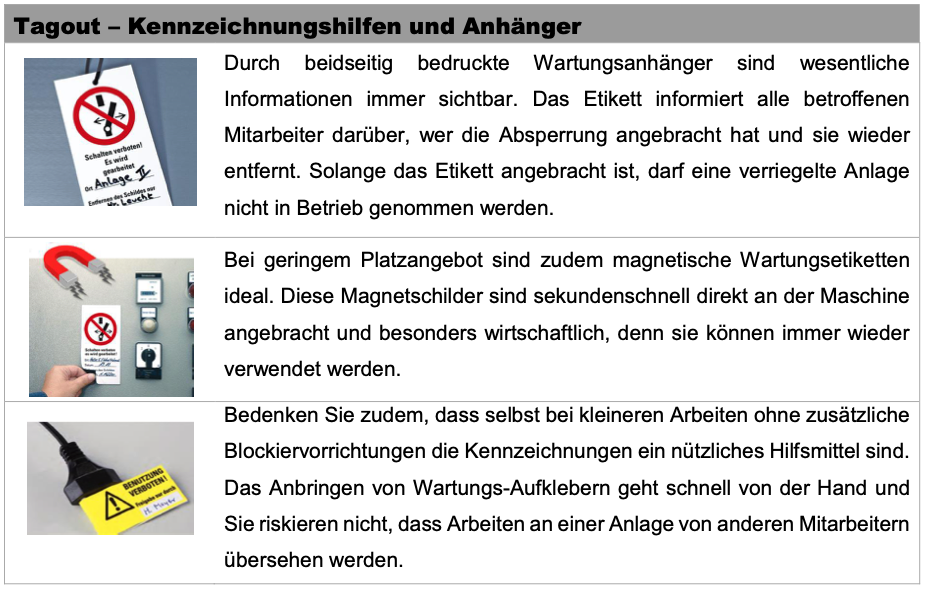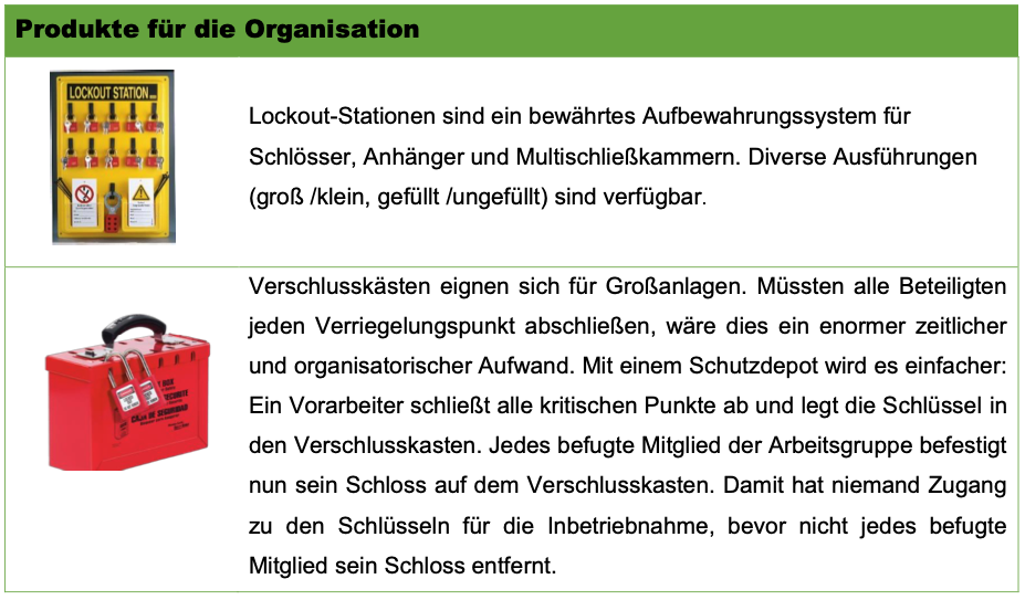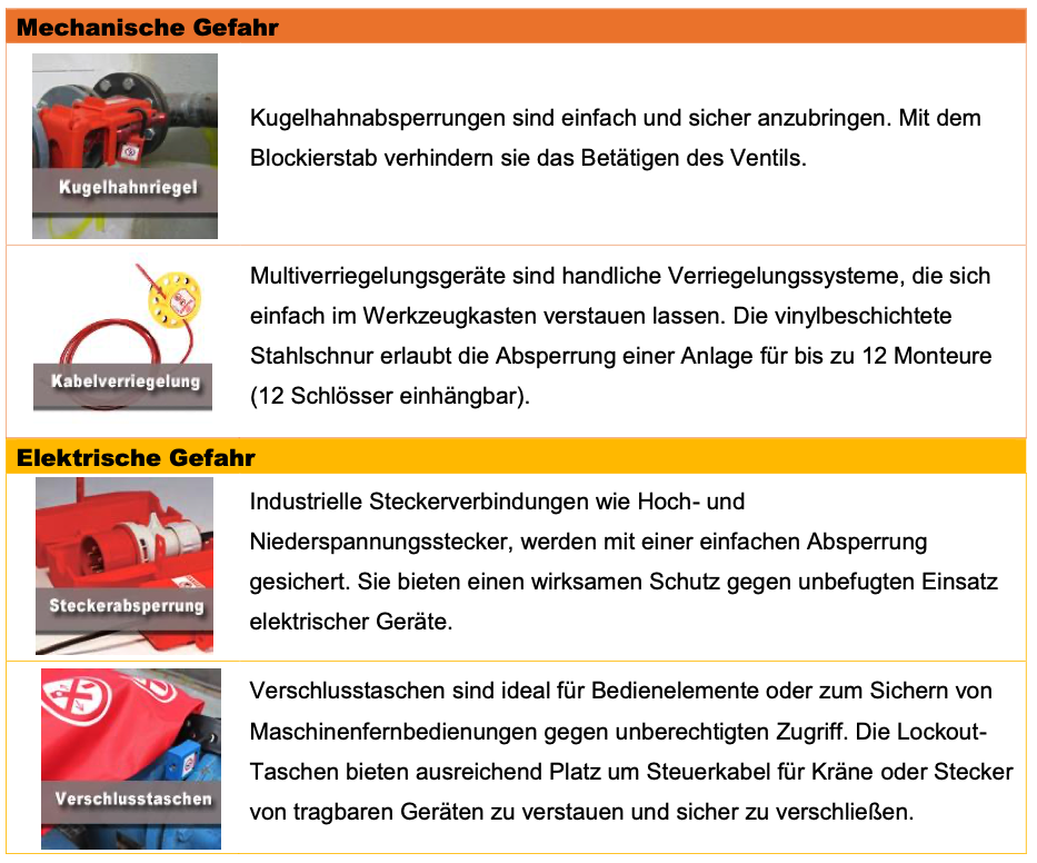 Der Markt bietet ein breites Sortiment an Wartungssicherung für Ihr Lockout-Tagout Programm. Wichtig ist, dass das Verriegelungssystem als solches erkennbar und langlebig ist. Es muss Umgebungsbedingungen mindestens für die Zeit der Wartung standhalten und Schutz vor Manipulation bieten.