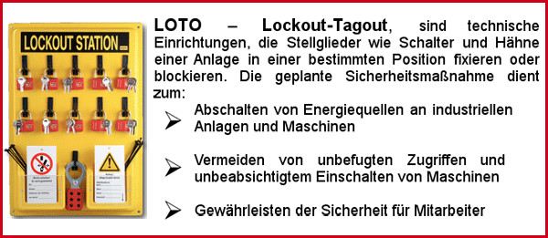 Dabei bieten doch wenige Dinge einen so effektiven Schutz wie ein Lockout-Tagout Verfahren. Sie nutzen dieses System noch nicht? Denken Sie über den Einsatz nach. HEIN gibt alle wichtigen Informationen. Verriegelungs- und Blockiersysteme sind im Englischen auch als Lockout Tagout (abk.: LoTo) bekannt. Mit LoTo werden kleine oder große Anlagen entsprechend fachgerecht gekennzeichnet und blockiert.
