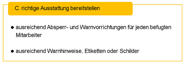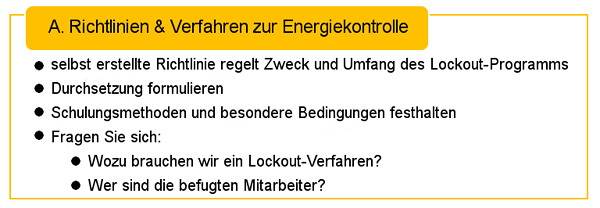 - Lockout, d.h. Hilfsmittel, die eine dauerhafte Abschaltung der Energie gewährleisten. Die Verriegelung besteht meist aus einem Mechanismus zum Blockieren und einem Schloss zum Verriegeln. Es soll verhindert werden, dass Geräte eingeschaltet werden. Beispiele sind Lockout-Schlösser, Ventilabsperrungen oder Schließkammern.