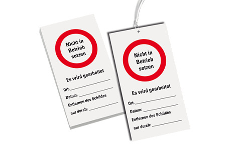 - Tagout, umfasst die auffällige Kennzeichnung an Lockout Vorrichtungen und weist auf abgeschaltete Maschinen und Geräte hin. Ziel ist, die Mitarbeiter über Wartungs- oder Instandhaltungsarbeiten zu informieren und ein Wiedereinschalten zu verhindern. Hierfür eignen sich Wartungsanhänger und –Aufkleber mit entsprechenden Warnhinweisen.