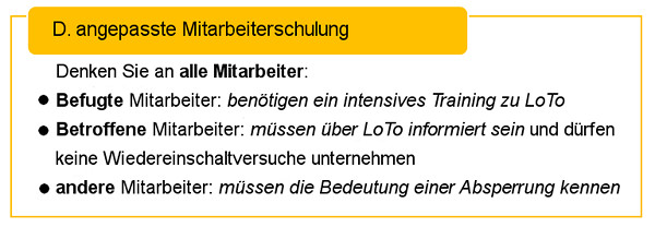 Entwickeln Sie ein LoTo-Verfahren für die bezeichneten Maschinen und legen fest, welche Schritte von Befugten Mitarbeitern ausgeführt werden müssen. Zusätzlich ist es wichtig, das Personal im Erkennen gefährlicher Energie und im LoTo-Verfahren anzulernen. Denn was bringt die richtige Ausstattung, wenn Mitarbeiter sich nicht an die Durchführung halten? Wichtig bei der Implementierung des Lockout-Tagout Programms ist daher die Mitarbeiterschulung. Nur so kann auch ein effektiver Schutz bestehen.