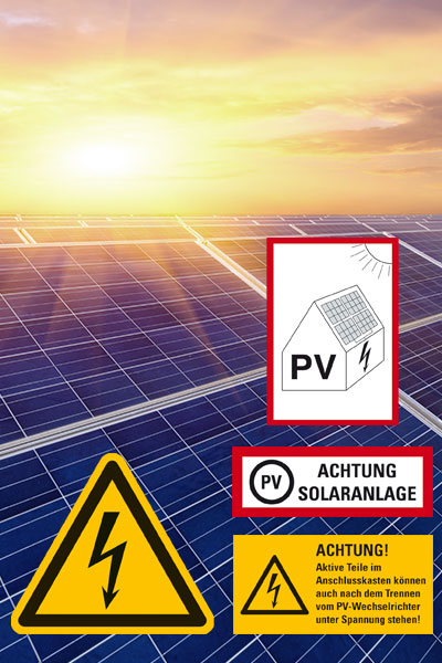 Um Photovoltaikanlagen sicher und normgerecht zu kennzeichnen, finden Sie in unserem Onlineshop ein umfassendes Sortiment: