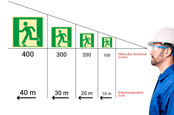 Zudem gibt die ASR A1.3 Angaben zum Beobachtungsabstand und der benötigten Größe von Rettungszeichen an.