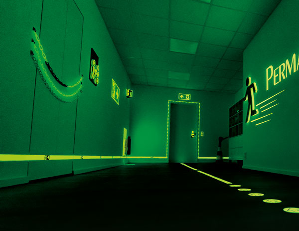 Ein ganzheitliches optisches Sicherheitsleitsystem verbindet Fußbodenmarkierungen, Wand- und Deckenkennzeichnungen und modulare Leuchten. Die nachleuchtenden und reflektierenden Komponenten ergänzen aktiv elektrisch betriebene Systeme und gewährleisten Redundanz.