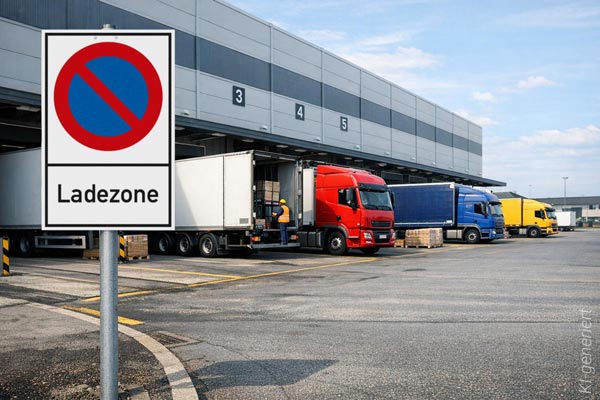 Ladezonen, Haltverbotsbereiche, Wegeführung, Ausschilderung für Lkw‑Verkehr
