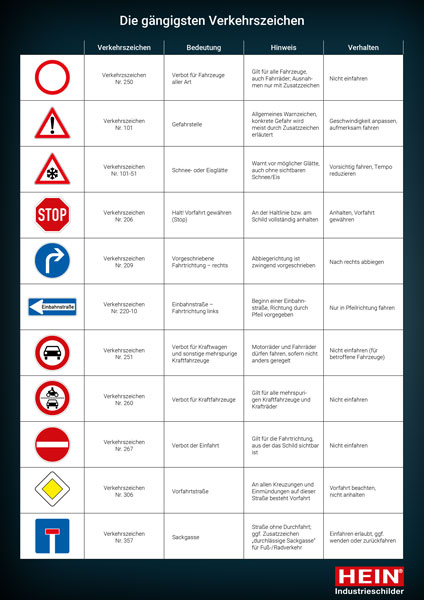 Eine Übersicht über die gängigsten Verkehrszeichen können Sie sich hier herunterladen.