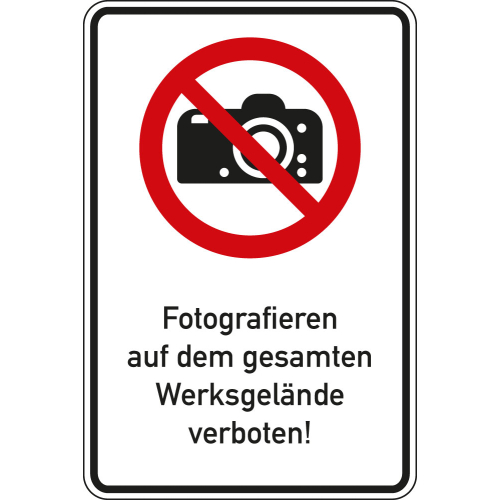 Kombi-Verbotsschild: Fotografieren auf dem gesamten Werksgelände verboten!, Piktogramm & Text, ISO, Aluminium RA0, 600 mm x 900 mm, 1 Stück