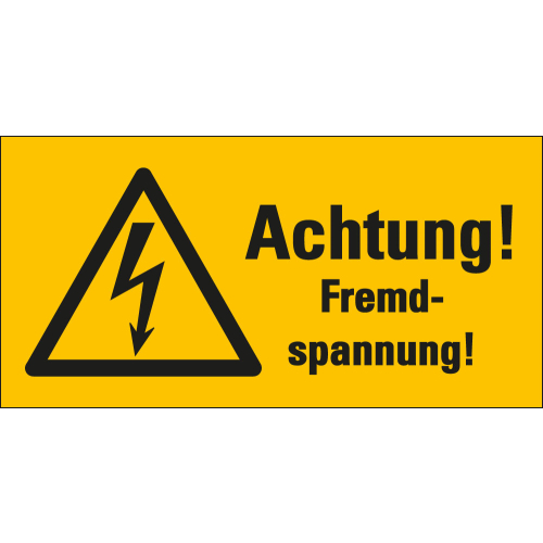 Warnschild / Warnzeichen: Achtung! Fremdspannung!, Blitzpfeil, RoHS konform, ASR/ISO, Folie selbstklebend, 52 mm x 26 mm, 10 St./Bogen