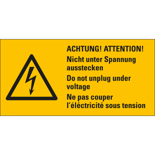 Warnschild / Warnzeichen: ACHTUNG! Nicht unter Spannung ausstecken, 3-sprachig, Blitzpfeil, RoHS konform, Folie selbstklebend, 74 mm x 37 mm, 1 Stück