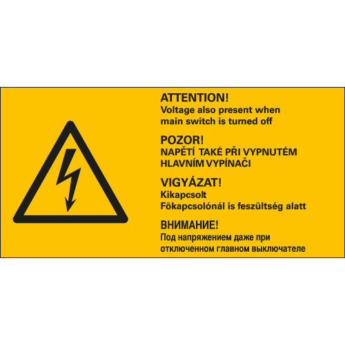 Warnschild / Warnzeichen: ATTENTION! Voltage also present when main switch is turned off, 4-sprachig, Blitzpfeil, RoHS konform, Folie selbstklebend, 74 mm x 37 mm, 1 Stück
