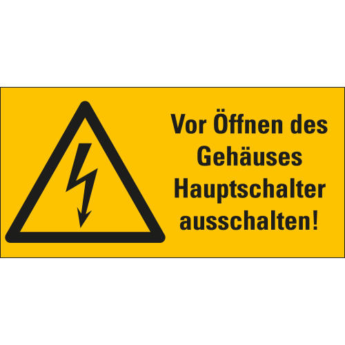 Warnschild / Warnzeichen: Vor Öffnen des Gehäuses Hauptschalter ausschalten, Blitzpfeil, Folie selbstklebend, 148 mm x 74 mm, 1 Stück