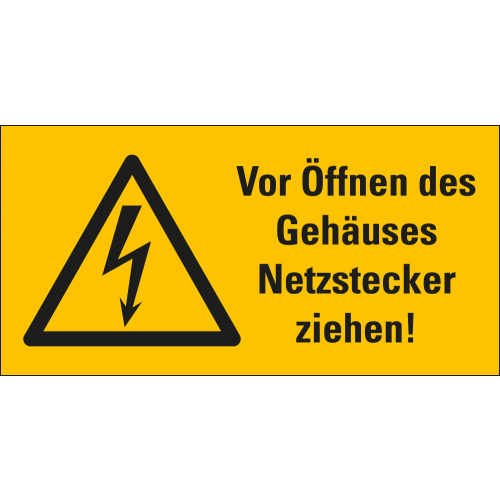 Warnschild / Warnzeichen: Vor Öffnen des Gehäuses Netzstecker ziehen, Blitzpfeil, Folie selbstklebend, 52 mm x 26 mm, 10 St./Bogen