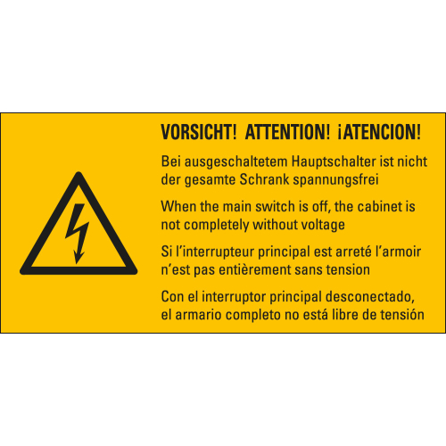 Warnschild / Warnzeichen: VORSICHT! Bei ausgeschaltetem Hauptschalter ist nicht der gesamte Schrank spannungsfrei, 4-sprachig, Blitzpfeil, RoHS konform, Folie selbstklebend, 74 mm x 37 mm, 1 Stück